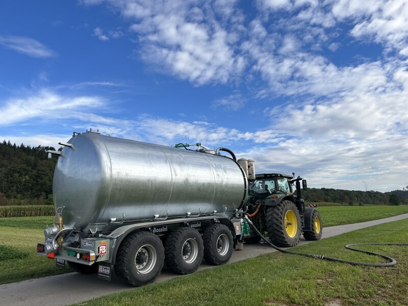Bei der Gülle Ausbringung setzen wir auf das System der Gülleverschlauchung. Wir verschlauchen Ihre Gülle direkt auf dem Hof ab Gülleloch auf die arrondierten Flächen Ihres Betriebes. Wir sind mit bis zu 700 Meter Flachschlauch ausgerüstet zum verschlauchen ab dem Gülleloch. Gepumpt wird mit dem Traktor und einer Doda Zentrifugalpumpe, welche auf unseren Bossini Fässern installiert sind. Sobald Ihre Parzellen stark befahrene Strassen queren oder einfach weit entfernt von Ihrem Betrieb sind, kommen unsere Transportfässer zum Zug. Mit unseren Bossini Fässern können wir 25 cbm Gülle transportieren und mit installierter Doda Pumpe direkt vom Feldrand aus pumpen und verschlauchen. Das Verteilfahrzeug ist mir Breitriefen ausgestattet um minimalen Bodendruck zu erzeugen. Fragen Sie uns an!