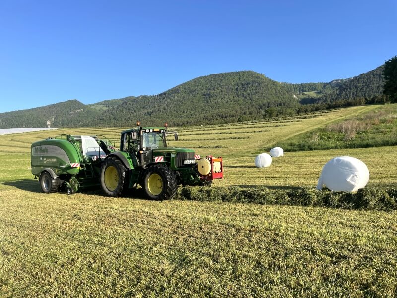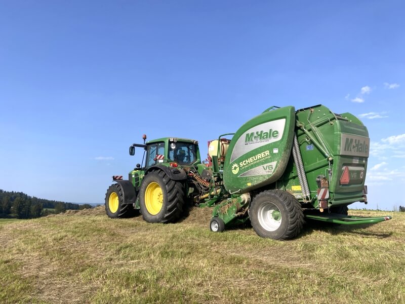 Bei der Silage Ernte sind wir mit zwei Rundballenkombinationen der Marke Mc Hale Fusion 3 für Sie im Einsatz. Beide Pressen sind mit Mantelfolienbindung ausgerüstet.
